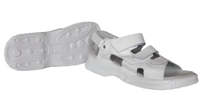 Sandále s monolitní PUR podešví. Anat. tvarovaná měkčená stélka obalená usní. Na nártu reflexní ozdoba. Vrch z usně, dvoupáskový nárt zapnutý pomocí přezek.